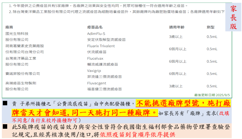 親愛的家長,您好, 貴 子弟所接種之「公費流感疫苗」皆由衛生局轉衛生所配發接種,不能挑選廠牌型號,如家長另有「廠牌」需求(改填不同意/自行至校外接種即可)