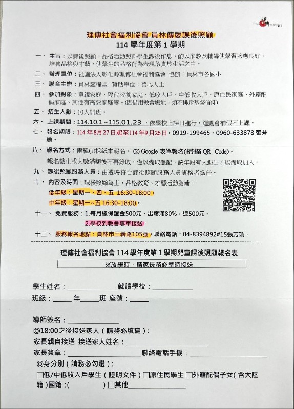 校外社福機構:〔愛加倍課後照顧班〕〔理傳員林傳愛課後照顧班〕申請表,如有需求者可自行下載 聯繫電話: 〔愛加倍課後照顧班〕04-8362713-32 (社工) 〔理傳員林傳愛課後照顧班〕04-8394892-15 (張芳瑜) |