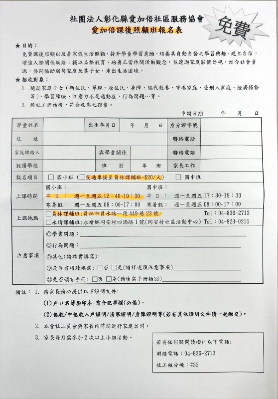 | 標題 | 校外社福機構:〔愛加倍課後照顧班〕〔理傳員林傳愛課後照顧班〕申請表,如有需求者可自行下載 |