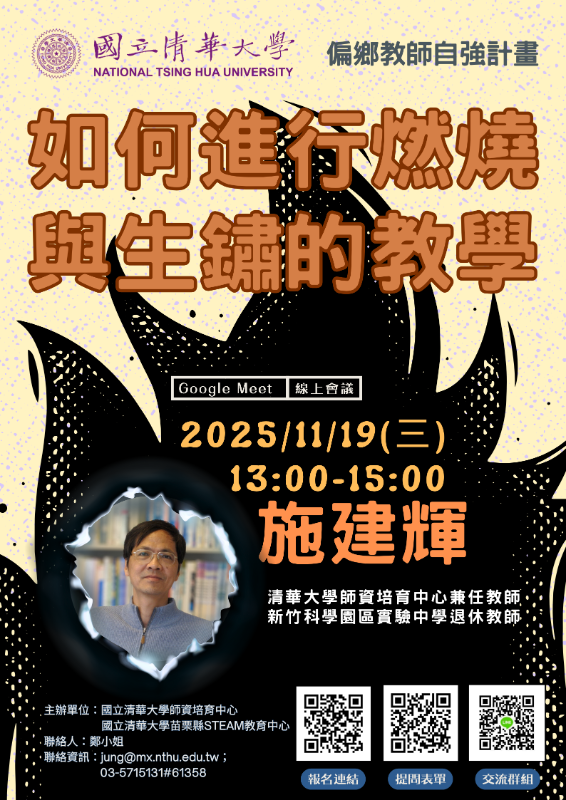 一、依據國立清華大學114年10月28日清師培字第1149008411號函辦理。 二、旨揭計畫係對於偏鄉國小非專長教師之輔導,以自然領域為主,並採線上演講、線上諮詢和實體指導方式進行教師協助。 二、線上講座資訊如下: (一)時間:114年11月19日(星期三)下午1時至3時。 (二)方式:視訊會議,連結:https://meet.google.com/qvr-irzh-vye。 (三)講師:國立清華大學師資培育中心施建輝兼任教師。 三、報名說明: (一)連結:https://forms.gle/GmpmoeBZULSk7CE28。 (二)對象:以偏鄉國小非自然科背景之自然科教師為主,也歡迎非偏鄉有需求之自然教師報名參加。 四、為增進參與旨揭計畫教師之交流及對於教材教法和學科知識之提問討論,國立清華大學業建立Line群組及開設提問表單(如海報QR Code),歡迎自由加入及進行提問。 五、如有相關疑問,請洽國立清華大學師資培育中心地方教育組鄭小姐(聯絡電話:03-5715131分機61358;電子郵件:jung@mx.nthu.edu.tw)。