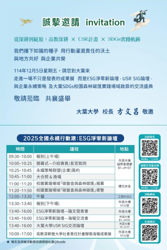 四、114年12月5日成果發表會邀請函(如附件)及活動訊息(如附件): (一)活動一:永續策略聯盟(企業)簽約儀式 (二)活動二:校園實踐場域「碳盤查與森林碳匯」揭幕與導覽 (三)活動三:ESG淨零新論壇論文發表會 (四)活動四:ESG淨零新論壇海報交流會 (五)活動五:大葉大學USR SIG交流論壇 (六)活動六:大葉大學高教深耕暨USR計畫靜態海報成果展 五、「2025全國永續行動潮:ESG淨零新論壇」再推出活動四:「海報交流會」,徵件說明與重要時程(如附件徵稿說明): (一)徵件主題:須與ESG、SDGs、USR、淨零碳排等相關議題契合,主題包含:1.環境、2.社會、3.治理、4.SDGs教育、5.應用AI於SDGs之推動或案例。 (二)徵件對象:全國高中職及大專校院師生、國教端教師、研究單位、USR團隊、企業夥伴、社區民眾及對本項活動有興趣之人士。 (三)投稿類型:Poster Session海報展,報名表件及海報格式下載http://dyu.edu.tw/33e2d (四)海報徵件報名:http://dyu.edu.tw/ce973 (五)重要時程: 1、稿件收件截止:114年11月14日(星期五) 2、初審結果通知:一週內 3、決賽發表與論壇舉行:114年12月5日(星期五) 六、活動相關網址: (一)論壇網站:http://dyu.edu.tw/250cb (二)成果發表會活動報名:http://dyu.edu.tw/3adee (至11月27日截止) (三)交通資訊:http://dyu.edu.tw/1a8de 七、聯絡資訊:校務發展暨品保處 【活動一、二】蘇辰宇先生,聯絡電話:04-8511888#2363;【活動三、四】林芳儀小姐,聯絡電話:04-8511888#1436;【活動五】許毓茹小姐,聯絡電話:04-8511888#1432;【活動六】魏宗豊先生,聯絡電話:04-8511888#1452;e-mail:emc2@mail.dyu.edu.tw。