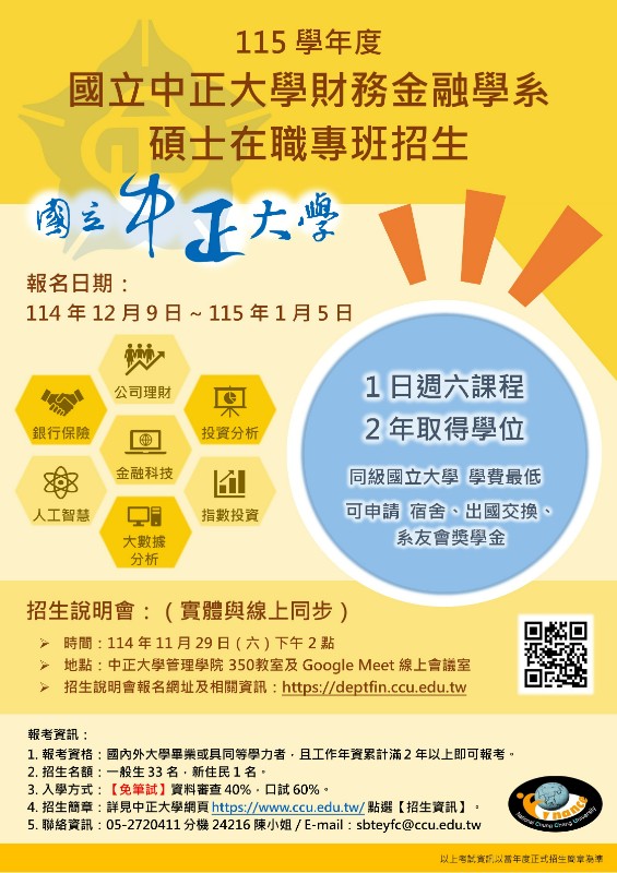 轉知:中正大學財務金融學系碩士在職專班115學年度招生宣傳海報