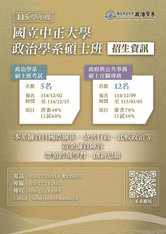 轉知:中正大學政治學系115學年度政府與公共事務碩士在職專班招生考試資訊