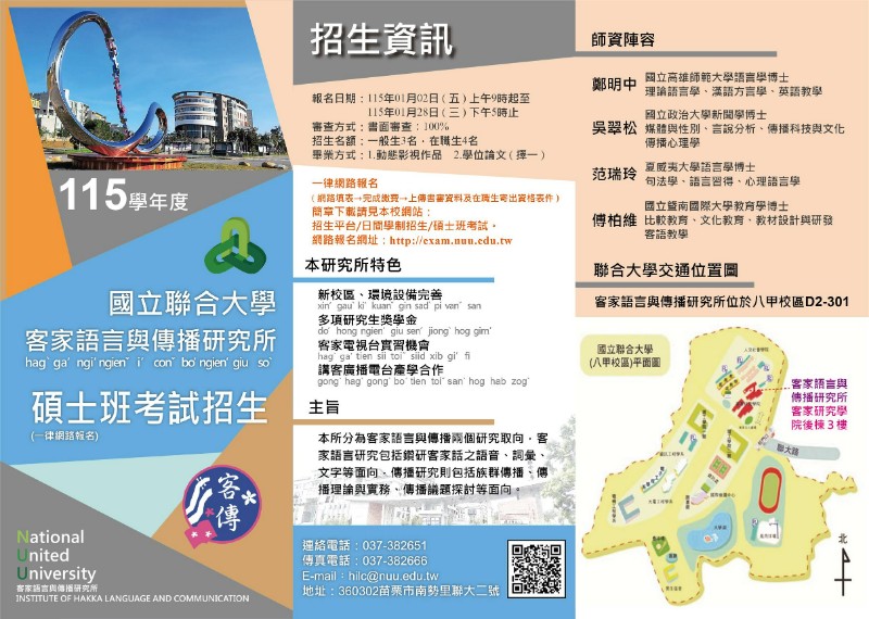 | 標題 | 轉知:國立聯合大學客家語言與傳播研究所115學年度碩士班考試招生資訊 |