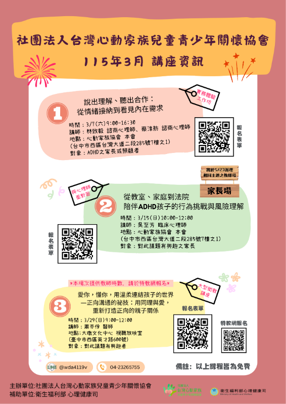 | 標題 | 轉知:社團法人台灣心動家族兒童青少年關懷協會辦理「115年03月 ADHD 相關主題 講座及工作坊」海報,符合需求之家長、照顧者、及教師等專業人員可報名參加。 |