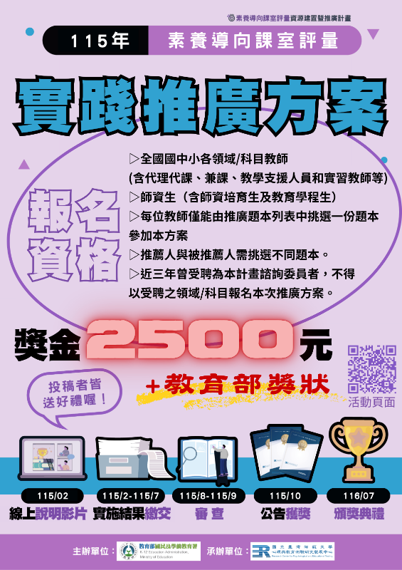 一、依據國立臺灣師範大學115年3月2日師大心測中字第1151004856號函辦理。 二、旨揭方案係鼓勵現場教師、師資培育生及相關教學人員施測該計畫已公告之評量工具,深化素養導向課室評量之理解與實踐,以回應十二年國教課綱之核心素養。 三、旨揭實施辦法如附件1,宣傳海報如附件2。報名及繳件資訊如下: (一)受理期間:即日起至115年7月31日止。 (二)受理方式:於該計畫官方網站線上辦理(網址:https://dpcca.rcpet.edu.tw/Activity/Selection/202602promote.aspx)。 四、活動若有未竟事宜,將另行公告於該計畫官方網站(網址:https://dpcca.rcpet.edu.tw/);如有疑問,請洽國立臺灣師範大學心測中心承辦窗口蘇小姐,電話02-2362-0770分機233,電子信箱yichsu@rcpet.ntnu.edu.tw。