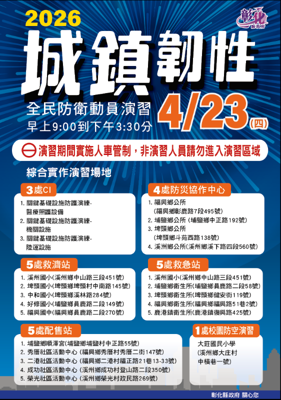 彰化縣政府謹訂於115年4月23日(星期四)於福興鄉、埔鹽鄉、埤頭鄉、溪州鄉等4個鄉(鎮、市)辦理彰化縣2026城鎮韌性(全民防衛動員)演習。 |