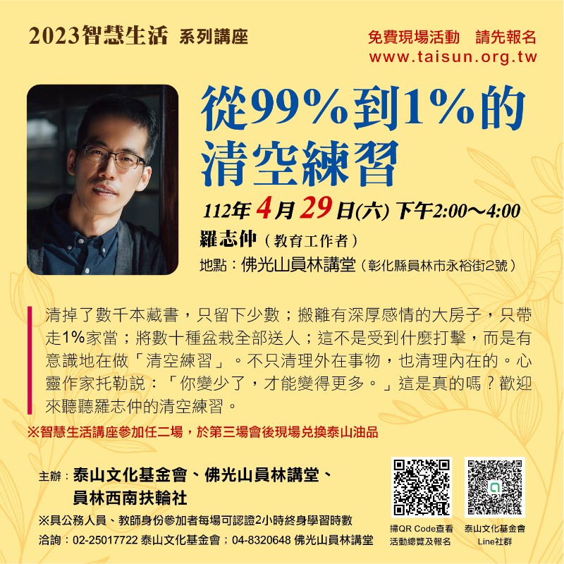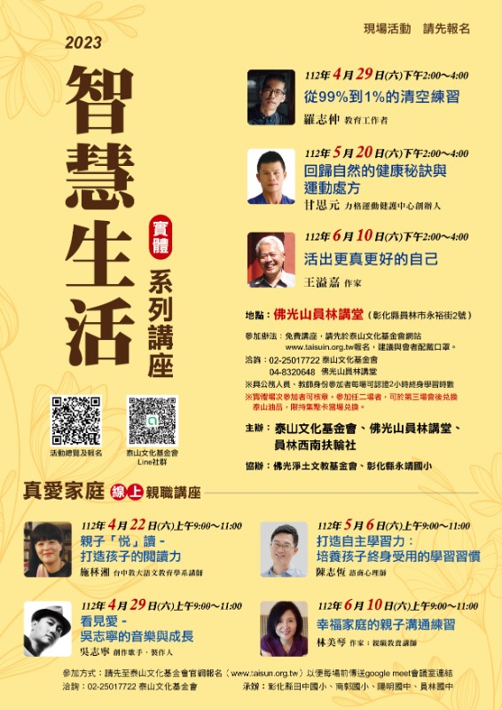 泰山文化基金會與佛光山員林講堂、員林西南扶輪社合辦「智慧生活講座」,將自4/29起辦理三場,邀請薩提爾對話推動者羅志仲老師、力格健護運動中心創辦人甘思元教練、作家王溢嘉老師談探討如何從容面對世界變化,從心理及日常行動出發,實踐智慧生活。