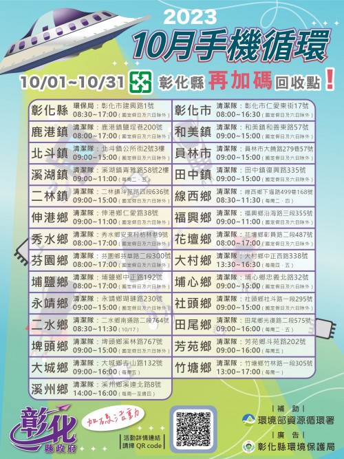 一、依據彰化縣環境保護局112年10月3日彰環工字第1120065034號函辦理。 二、為鼓勵民眾回收廢手機,環境部持續結合業者及縣市環保局共計提供超過 1.3萬個回收據點,使回收更便利,供民眾選擇,其中該局與各鄉鎮市公所,亦加入回收據點行列,提供27處回收兌換點,並再加碼贈送精美小禮物。 三、活動新聞已於112年9月26日發布,詳「環境部資源循環署/公告訊息/新聞發布」(https://gov.tw/Mgr);民眾抽獎登錄網(https://phonerec.com.tw/)。