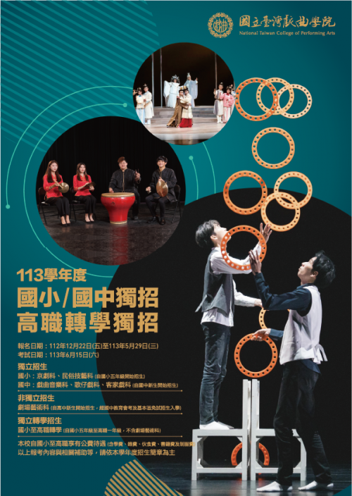 轉知:國立臺灣戲曲學院113學年度高職以下(含國小與國中)公費單獨招生暨轉學單獨招生