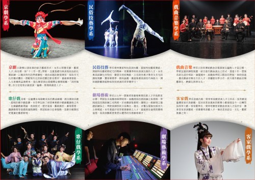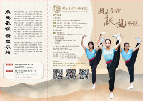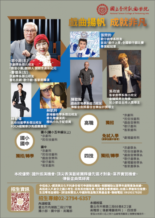 國立臺灣戲曲學院為全國唯一12年一貫制培育傳統表演藝術專業人才首府,入學後均享公費待遇,經升部評鑑通過者可直升國(高)中及四技部(如附件)。