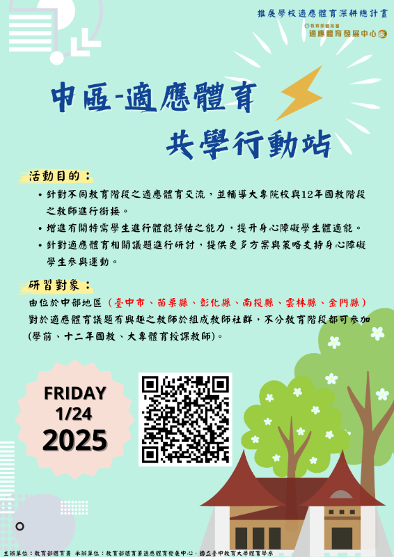一、依據教育部體育署114年1月8日臺教體署學(二)字第1140000468號函辦理。 二、本案共學行動站為跨校跨縣市跨領域之社群,針對不同教育階段之適應體育交流,輔導大專院校與各階段之教師進行銜接,針對融合式體育課相關議題進行研討,以提升身心障礙學生身體素養。 三、研習資訊摘要如下: (一) 參加對象:中部地區(臺中市、苗栗縣、彰化縣、南投縣、雲林縣、金門縣)對於融合式體育議題有興趣之教師於組成教師社群,不分教育階段(學前、十二年國教、大專體育授課教師以及資源教室輔導員等)都可參加。 (二) 報名日期與方式:即日起至114年1月16日止。採線上報名,請逕至報名網址:https://forms.gle/LDP41WzHQFGb6aBs5完成報名手續。 (三) 第1次研習時間為114年1月24日(星期五)上午9時至下午16時,於國立臺中教育大學體育學系求真樓401教室。後續研習日期、主題和地點將於第1次社群日討論後發布。 (四) 本案詳細內容請參閱附件資訊。 四、本案如有相關詢問事項,請逕洽國立臺灣師範大學專案助理:李先生( 電話: 02-7749-5301 , 電子信箱: lac.ntnu@gmail.com)。