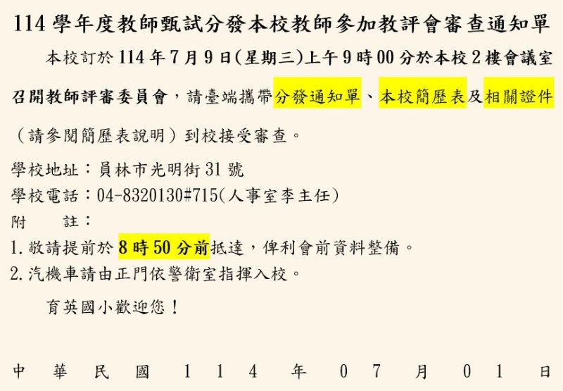 [重要]114學年度教師甄試分發本校教師參加教評會審查通知單。