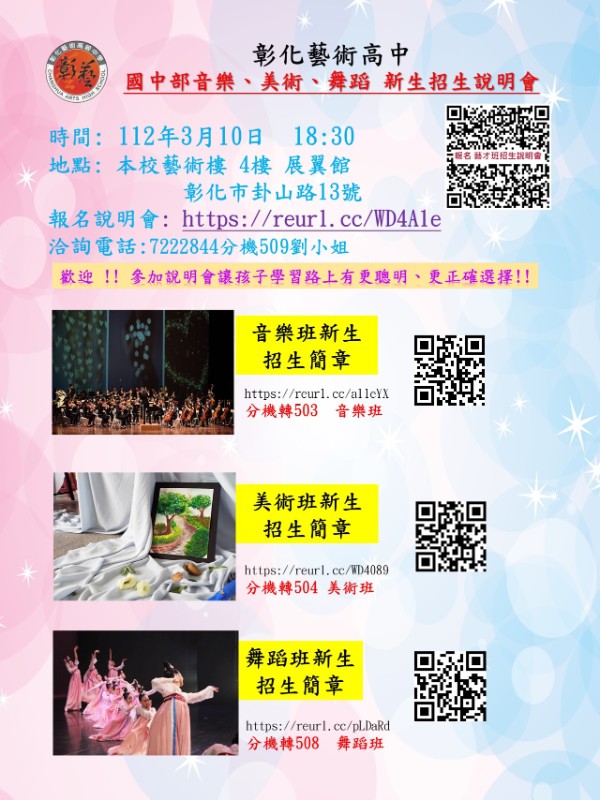 彰化藝術高中藝才班謹訂於112年3月10日(星期五)於學校展翼館舉辦「藝才班招生說明會」,敬邀高年級學生參加。