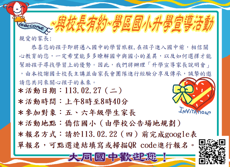 | 標題 | 轉知:112學年度大同國中學區國小升學宣導活動 |