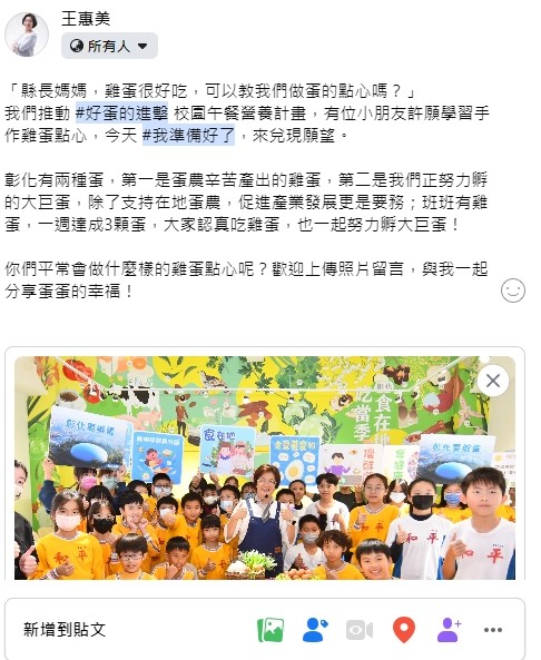 | 標題 | 訊息轉知:有關本縣推動「好蛋的進擊 校園午餐營養計畫」,鼓勵多加採用雞蛋料理,請貴校鼓勵師生至縣長臉書指定貼文分享「蛋蛋的幸福」照片及文字 |