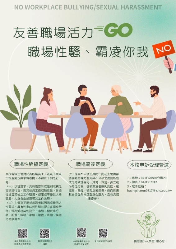 (一)以性要求、具有性意味或性別歧視之言詞或行為,對其他員工造成敵意性、脅迫性或冒犯性之工作環境,侵犯或干擾其人格尊嚴、人身自由或影響其工作表現。 (二)主管對下屬或求職者以明示或暗示之性要求、具有性意味或性別歧視之言詞或行為,做為勞務契約成立、存續、變更或分發、配置、報酬、考績、陞遷、降調、獎懲之交換條件。 職場霸凌定義:工作場所中發生其同仁間或主管與部屬間藉由權力濫用與不公平之處罰所造成之持續性冒犯、威脅、冷落、孤立或侮辱之行為,使被霸凌者感到受挫、被威脅、羞辱、被孤立或受傷,進而折損其自信並帶來沉重身心壓力,且有具體事證者。 本校申訴受理管道: 1、專線:04-8320810分機20 2、傳真:04-8357242 3、電子信箱:huangsharon0717@ chc.edu.tw |
