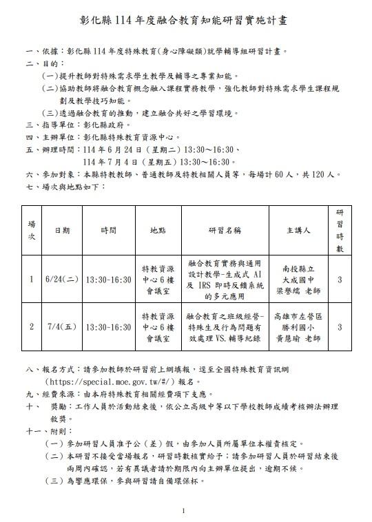 轉知:彰化縣政府辦理114年度融合教育知能研習實施計畫 說明: 一、依據本縣114年度融合教育知能研習實施計畫辦理。 二、為提升教師對特殊需求學生教學及輔導之專業知能,協助教師將融合教育概念融入課程實務教學,強化教師對特殊需求學生課程規劃及教學技巧知能,透過融合教育的推動,建立融合共好之學習環境,特辦理本次研習。 三、參加對象:本縣特教教師、普通教師及特教相關人員等,每場計60人,共120人。 四、研習資訊: (一)研習時間:共2場次請擇1場次參加。 1、融合教育實務與通用設計教學-生成式AI及IRS即時反饋系統的多元應用:114年6月24日(星期二)13:30至16:30。 2、融合教育之班級經營-特殊生及行為問題有效處理VS.輔導紀錄:114年7月4日(星期五)13:30至16:30。 (二)研習地點:彰化縣特教資源中心611會議室(彰化縣彰化市泰和路二段145巷1號)。 五、參加研習人員請准予公(差)假登記。 六、各場次全程參與研習老師,核發研習時數3小時。七、報名方式:請參加教師於研習前逕至全國特殊教育資訊網報名(https://special.moe.gov.tw/#/),不接受現場報名。 八、本案聯絡人:特教中心輔導組林詩涵老師,7273173分機311。