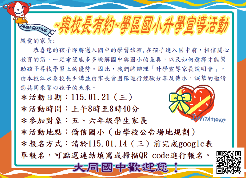 | 標題 | 轉知:員林市三所國中蒞校辦理六年級學生升學宣導資訊,歡迎有興趣家長踴躍參加。 |