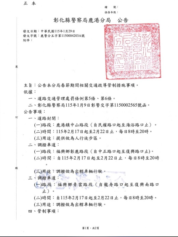 彰化縣警察局鹿港分局春節期間相關交通疏導管制措施事項公告1份