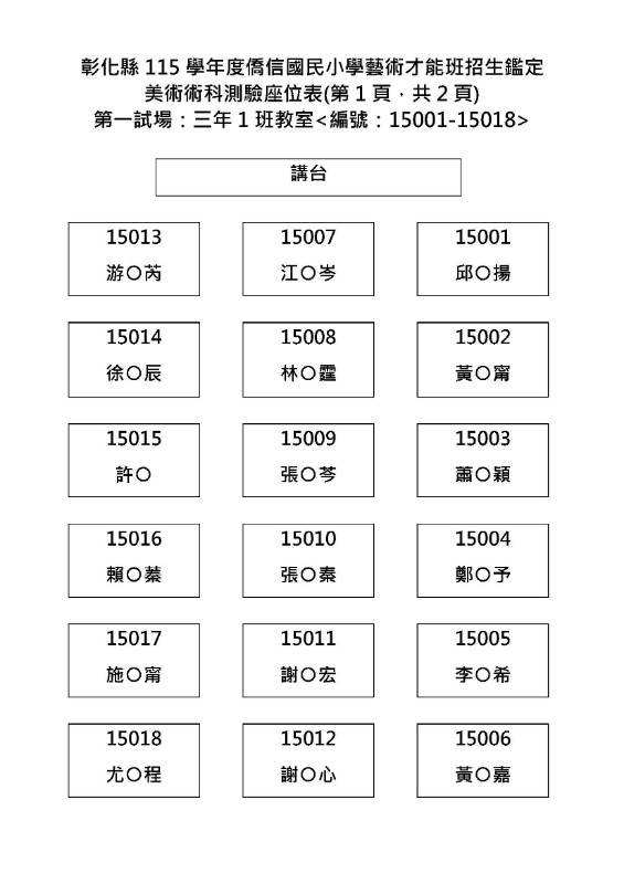 僑信國小115學年度藝術才能班試場座位表公告 如附件