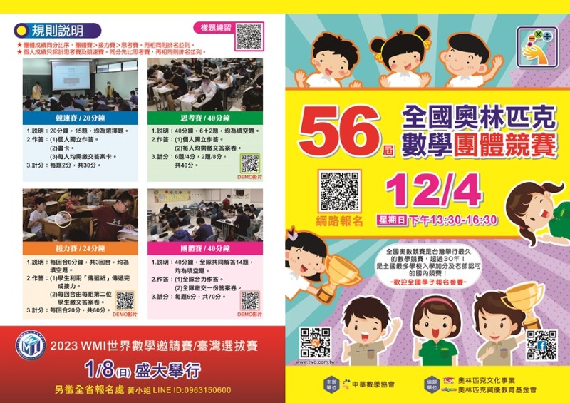 中華數學協會為推廣國小、國中至高中之數理教育,謹訂於 111 年 12 月 4 日(日) 舉辦 「第 56 屆全國奧林匹克數學團體競賽」,旨在培養學童對數理的興趣,為國家培育優秀人才。歡迎共襄盛舉。