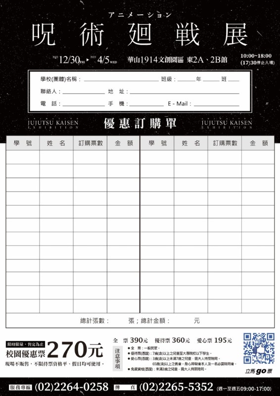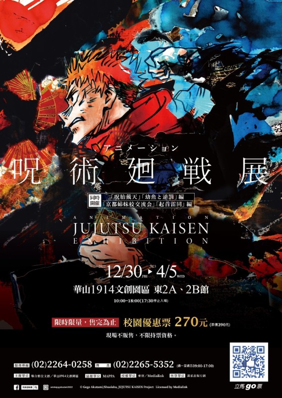聯合數位文創股份有限公司訂於111年12月30日~112年4月5日於華山1914文創 產業園區東2A東2B館舉辦「咒術迴戰」展,鼓勵師生及家長踴躍參與。
