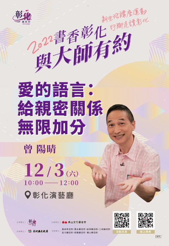 彰化縣文化局訂於111年12月3日辦理「2022書香彰化─與大師有約」專題講座第12場次,請所屬同仁、師生踴躍參加。