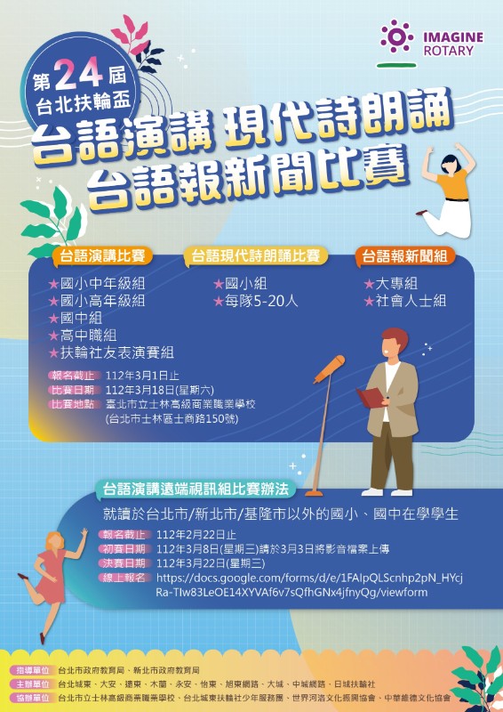 標題 轉知 台北城東扶輪社辦理「第二十四屆台北扶輪盃台語演講遠端視訊組比賽」活動辦法、報名表及海報各1份,請踴躍報名參加。