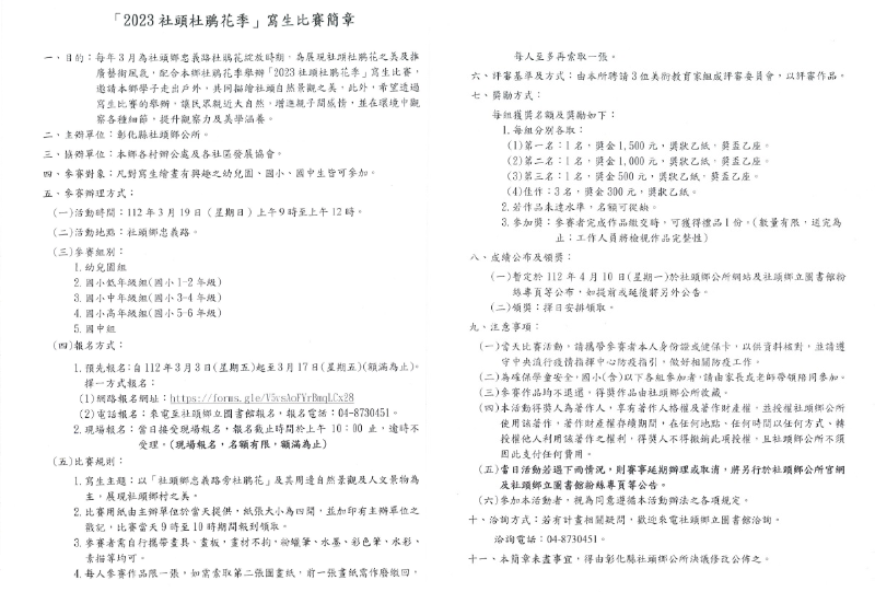 彰化縣社頭鄉公所辦理「2023社頭杜鵑花季」寫生比賽1案,請鼓勵學生踴躍參與。