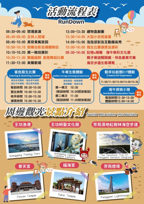 彰化縣政府農業處辦理2023國際海牛文化節「海牛FUN藝彩著色寫生比賽」,歡迎幼兒園學童及國小學生踴躍報名。 一、依據本府農業處112年5月10日府農漁字第1120179736號書函辦理。 二、2023國際海牛文化節邀請喜愛寫生的國小學生及幼兒園孩子們「聚繪」在芳苑,透過雙眼及畫筆紀錄交織出每位孩子心中獨特的芳苑海牛文化。 三、比賽時間地點及報名資訊: (一)比賽時間:112年5月28日(星期日)上午9時30分至下午1時30分。 (二)比賽報到時間及地點:112年5月28日(星期日)上午9時30至10時,於普天宮前廣場服務台。 (三)比賽地點:芳苑鄉普天宮(彰化縣芳苑鄉芳漢路芳二段161巷100號)及周邊適合寫生之地點。 (四)比賽組別:著色幼兒園組、著色國小低年級組、寫生國小中年級組、寫生國小高年級組4組。 (五)報名方式採網路報名,報名時間自112年5月15日(星期一)上午10時起至5月23日(星期二)下午5時止,如提前額滿則停止報名。 (六)活動詳情請至報名網站(https://reurl.cc/9Vj42Y)查詢。 四、倘有任何疑義,請致電洽詢海牛聚繪寫生比賽活動小組 0906-799-308。 五、檢送寫生比賽、活動海報及流程各1份。