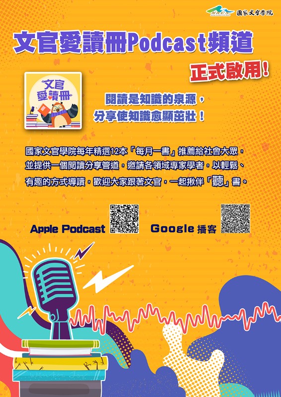 為擴大公務人員專書閱讀多元學習管道,國家文官學院成立「文官愛讀冊」Podcast頻道,請多加利用。