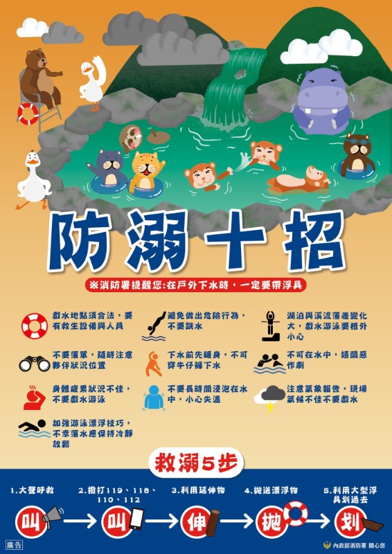 5.游泳防溺多注意,慎選安全的水域,戲水請著救生衣,結伴同行保平安。
