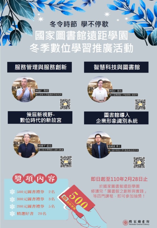 轉知國家圖書館即日起至110年2月28日(星期日)辦理「冬 令時節‧學不停歇-109年度冬季數位學習推廣活動」, 請貴校惠予協助宣傳,並鼓勵貴校圖書館管理人員、閱讀 推動教師及其他公教人員踴躍參加,請查照。