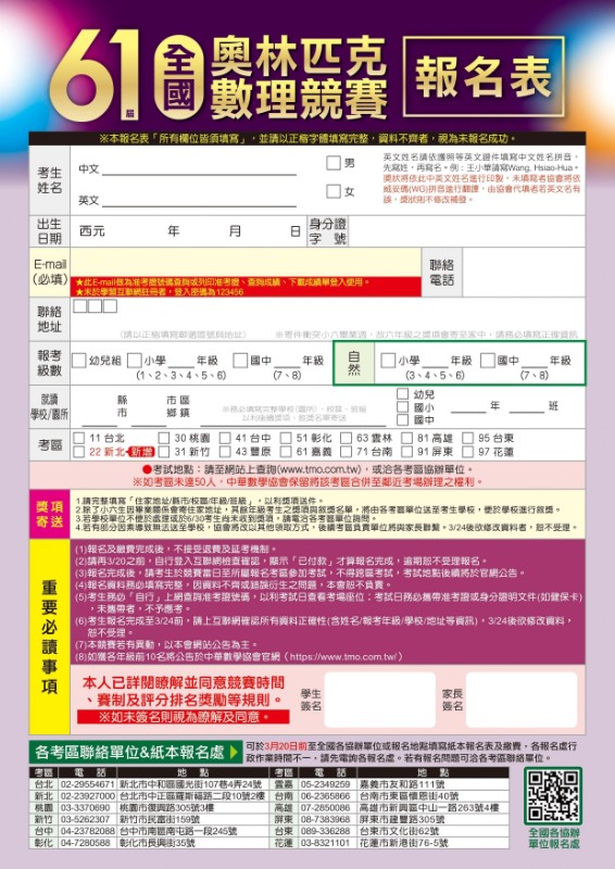 中華數學協會為推廣幼兒、國小及國中之數理教育,謹訂於114年4 月27日(星期日)舉辦 「第61屆全國奧林匹克數理競 賽」,旨在培養學童對數理的興趣,為國家培育優秀人才。歡迎共襄盛舉。