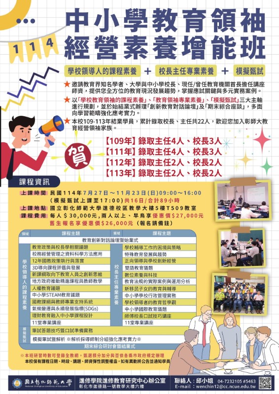 國立彰化師範大學進修學院推廣教育「魔術星空數學師資培訓工作 坊」、「114年中小學教育領袖經營素養增能班(原「中 小學校長、主任經營素養培訓班」)」招生簡章。