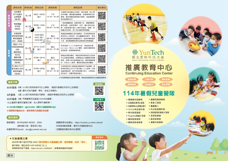 國立雲林科技大學推廣教育中心「2025年暑期兒童知能培訓營」宣傳單,鼓勵學生踴躍報名參加。