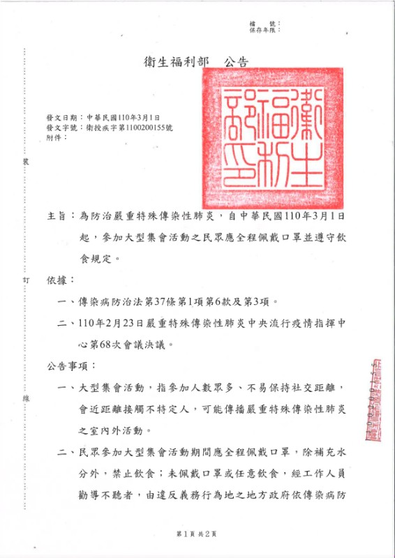 轉知衛生福利部業於110年3月1日以衛授疾字第1100200155號公告「為防治嚴重特殊傳染性肺炎,自中華民國110年3月1日起,參加大型集會活動之民眾應全程佩戴口罩並遵守飲食規定」。