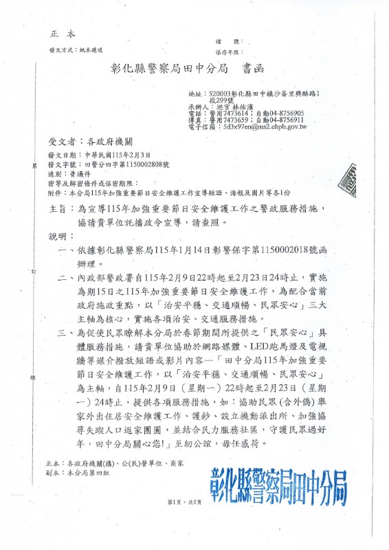 田中分局115年加強重要節日安全維護工作,以「治安平穩、交通順暢、民眾安心」為主軸,提供各項服務措施,如:協助民眾家外出住居安全維護工作、護鈔、設立機動派出所、加強協尋失蹤人口返家團圓,並結合民力服務社區,守護民眾過好年,田中分局關心您!