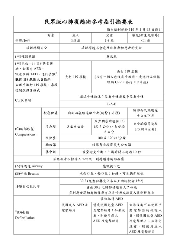 轉知衛生福利部「民眾版心肺復甦術參考指引摘要表」。