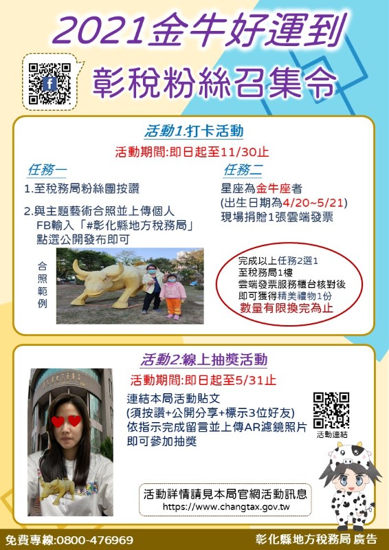為推廣各項稅務新知,彰化縣地方稅務局舉辦「減碳新生活 稅單e齊來」等3個租稅宣導活動,請同仁踴躍參加。