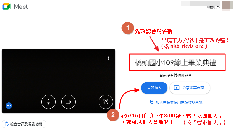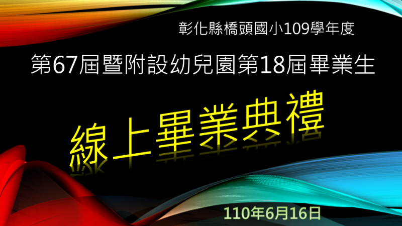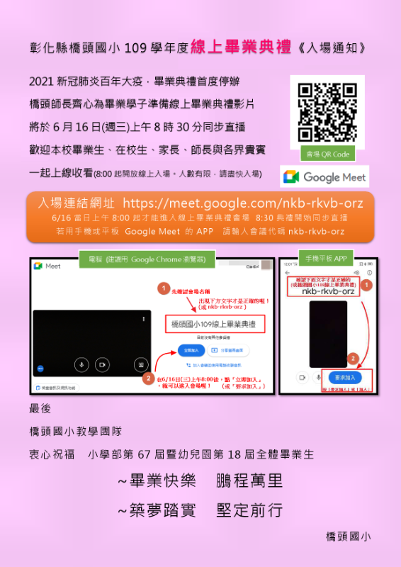 彰化縣橋頭國小109學年度線上畢業典禮《入場通知》 2021新冠肺炎百年大疫,畢業典禮首度停辦,橋頭師長齊心為畢業學子準備線上畢業典禮影片,將於6月16日(週三)上午8時30分同步直播,歡迎本校畢業生、在校生、家長、師長與各界貴賓,一起上線收看 入場連結網址 https://meet.google.com/nkb-rkvb-orz 最後,橋頭國小教學團隊衷心祝福