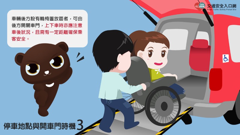 (三)步驟3:確認安全無人車。(四)步驟4:反手開車門至適當縫隙。(五)步驟5:確認安全後儘速下車並關車門。三、騎乘自行車或機車時,如路邊有車輛停放,應儘量與路旁車輛保持1個車門以上的安全間隔。四、相關安全開關車門資料可逕至交通安全入口網(https://168.motc.gov.tw/)查詢