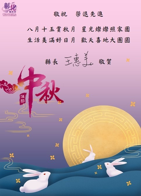 依彰化縣政府函轉知 110年中秋節將至,為表達對所屬各級學校退休人員關懷慰問之意,檢附中秋節電子賀卡1份。 祝本校退休人員健康平安。