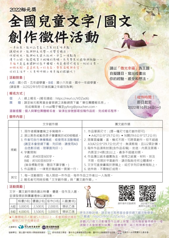 財團法人裕元教育基金會辦理之「2022裕元 獎-全國兒童文字/圖文創作徵件活動」,請學生踴躍投稿參加。