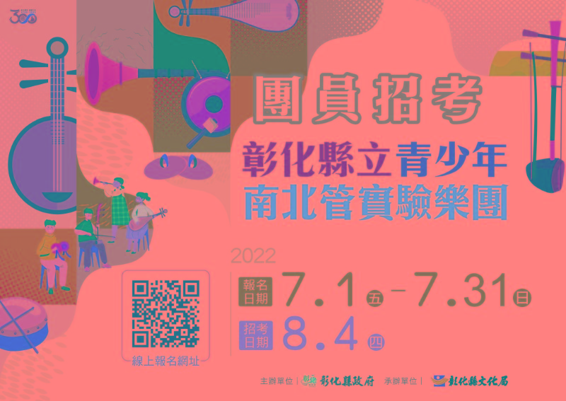 彰化縣文化局辦理「彰化縣立青少年南北管實驗樂團」團員招考延長報名時間至111年7月31日止,請學生踴躍報名。