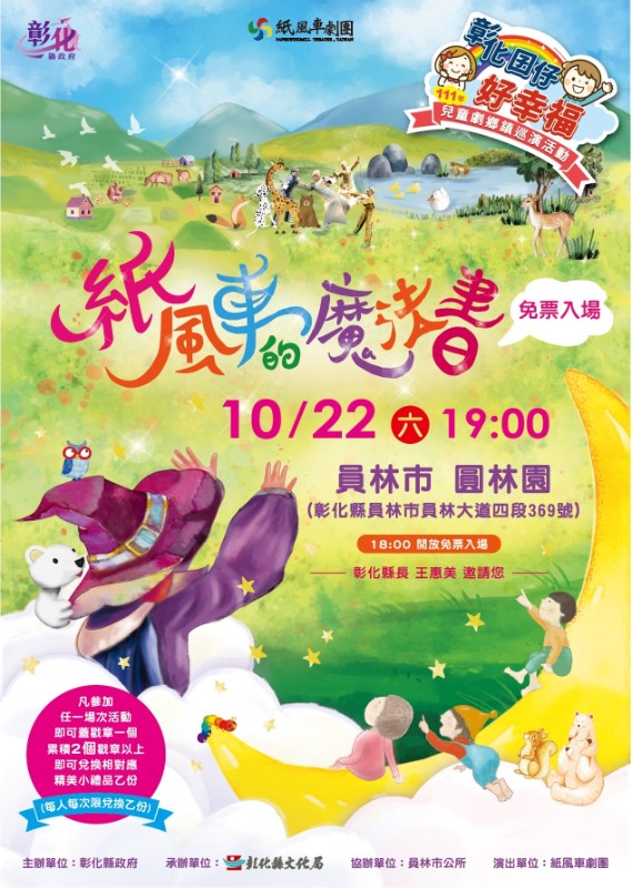 彰化縣政府「彰化囝仔好幸福─111年兒童劇 鄉鎮巡演活動」,10月22日(星期六)晚上7點於員林市圓林 園 ,演出「紙風車劇團」《紙風車的魔法書》,歡迎闔家觀賞。