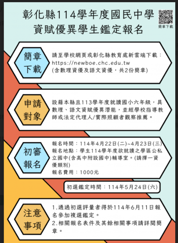 一、依據本縣114學年度國民中學學術性向資賦優異學生鑑定安置簡章辦理。 二、本次報名時間為114年4月22日(星期二)至4月23日(星期三),申請對象為設籍本縣且113學年度就讀國小六年級,具學術性向資賦優異潛能,並經國小指導教師或法定代理人/實際照顧者觀察推薦,其餘事項請詳閱各類簡章。