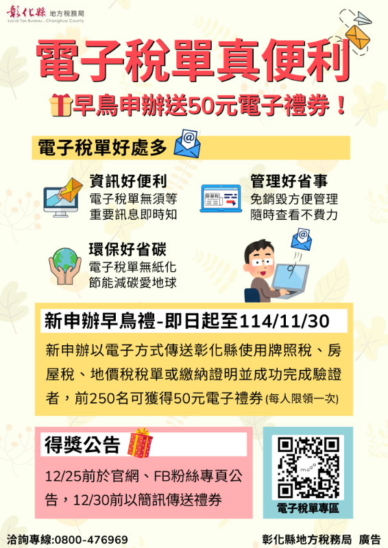 即日起至114年11月30日止,首次申請以電子方式傳送彰化縣使用牌照稅、房屋稅、地價稅等稅單或繳納證明,並完成驗證,就有機會獲得電子禮券,歡迎踴躍參加,彰化縣地方稅務局關心您。