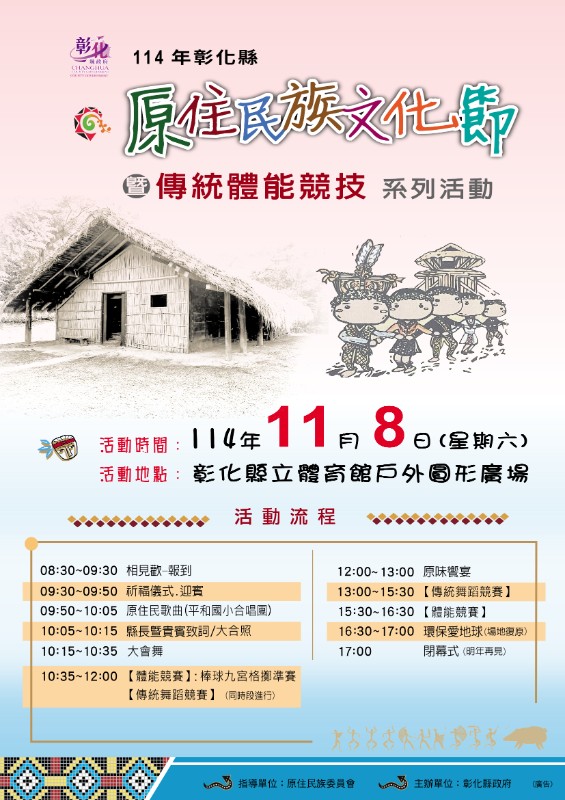 本縣一年一度原住民族文化盛事「114年彰化縣原住民族文化節暨傳統體能競技系列活動」,訂於114年11月8日(星期六)在彰化縣立體育館戶外圓形廣場(彰化市健興路1號)舉辦,節目內容多元豐富,詳情請見彰化縣政府民政處網站(https://civil.chcg.gov.tw/03bulletin/bulletin03.aspx)及「彰化縣原住民生活館」臉書粉絲專頁(https://www.facebook.com/p/彰化縣原住民生活館-100064533528742/?locale=zh_TW),請協助宣傳周知。